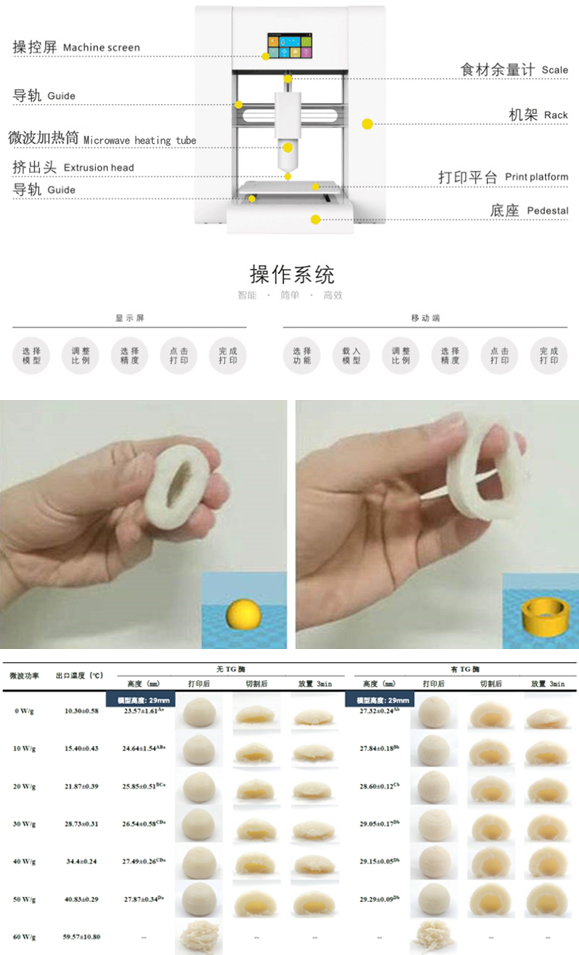 食品微波3D打印機工作原理及使用特性:1.食品微波3D打印機,就是基于熔融擠出型(FDM)3D打印技術,結合微波聚焦式加熱系統,通過對擠出噴嘴內快速流動的毫米級物料進行集中加熱的形式,實現3D打印食品即時固化及熟化的新型食品3D打印技術。微波食品3D打印機利用聚焦式微波加熱技術在極小的空間內將正在擠出的物料進行快速加熱,通過功率及物料性質的調整,實現物料的擠出即時固化。配合3D模型控制系統,通過X、Y、Z三軸的機械運動,按照模型生成的路徑通過馬達物理式擠出食材,層層做疊加,zui終實現食品的立體成型。魚糜、肉糜、蝦糜、植物蛋白濃縮物、面團等熱凝膠型物為適用于此微波食品3D打印機的一類食材。非熱凝膠型流體類食材亦可通過配料調整適配此微波食品3D打印機。先歐微波3D食品打印機已經是一款智能硬件,內置有無線網卡,連接WIFI,可實現通過移動端的APP來操作,所有的數據都可實現在云端來交互。目前軟件可以實現的功能有A.線上海量數據庫選取一鍵打印;B.手繪打印;C.文字輸入打印;D.拍照打印;E.微波功率實時在線調整。硬件的交互體驗做到了零門檻,觸動指尖即可一鍵打印,讓創造變成現實人人唾手可得.